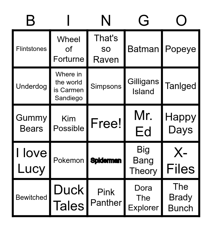 This bingo card has a free space and 54 words: Bill Cosby Show, I love Lucy, Andy Griffith Show, Star Trek, Spiderman, Mission Impossible, Batman, Wonder Woman, Underdog, The Jetsons, Flintstones, Doctor Who, Duck Tales, Bewitched, Adams Family, Pink Panther, The Brady Bunch, Gilligans Island, Boy Meets World, Happy Days, Big Bang Theory, The Office, Mr. Ed, Popeye, Jeopardy, Wheel of Forturne, Veggietales, Fresh Prince of Bel Air, Sesame Street, Dora The Explorer, Hannah Montana, Mr Rogers, Twilight Zone, Suite Life of Zack and COdy, That's so Raven, Monday night Raw (2000), Gummy Bears, X-Files, Mandalorian, Where in the world is Carmen Sandiego, Bob The Builder, Hawaii 5-0, Green Acres, Fast Layne, Pokemon, Monk, Laverne & Shirley, Family Fued, Simpsons, Kim Possible, Tanlged, Friends, Phil of the Futue and Wanda vision.