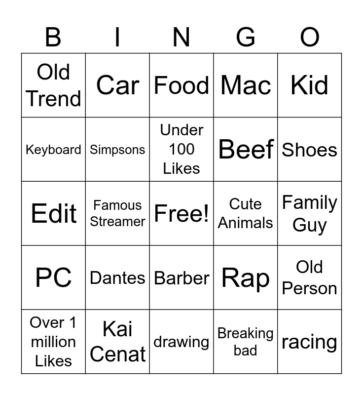 This bingo card has a free space and 24 words: Dantes, Kai Cenat, Under 100 Likes, Over 1 million Likes, Kid, Old Trend, Keyboard, Car, Cute Animals, Barber, Beef, Edit, Rap, Old Person, Simpsons, Breaking bad, Family Guy, Food, Shoes, Famous Streamer, racing, PC, Mac and drawing.