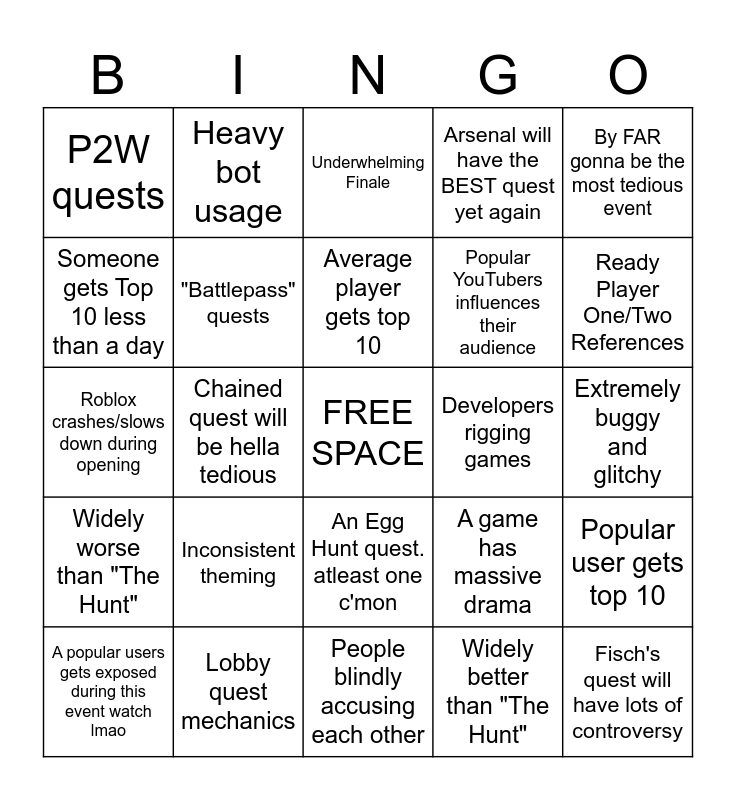 This bingo card has a free space and 24 words: Inconsistent theming, Lobby quest mechanics, Average player gets top 10, A popular users gets exposed during this event watch lmao, By FAR gonna be the most tedious event, P2W quests, Someone gets Top 10 less than a day, Heavy bot usage, Developers rigging games, An Egg Hunt quest. atleast one c'mon, Popular YouTubers influences their audience, Roblox crashes/slows down during opening, A game has massive drama, Popular user gets top 10, "Battlepass" quests, Widely better than "The Hunt", Extremely buggy and glitchy, Underwhelming Finale, Ready Player One/Two References, Chained quest will be hella tedious, Fisch's quest will have lots of controversy, Widely worse than "The Hunt", Arsenal will have the BEST quest yet again and People blindly accusing each other.