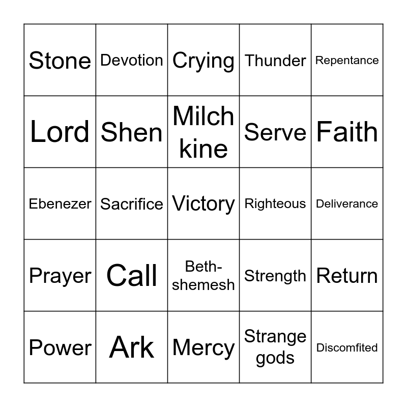 This bingo card has 40 words: Samuel, Ebenezer, Mizpeh, Shen, Ark, Beth-shemesh, Milch kine, Philistines, Repentance, Prayer, Sacrifice, Thunder, Victory, Deliverance, Righteous, Call, Answer, Stone, Help, Crying, Return, Strange gods, Serve, Lord, Israel, Mizpeh, Battle, Hitherto, Discomfited, Hear, Worship, Power, Seek, Strength, Faith, Mercy, Grace, Trust, Devotion and Triumph.
