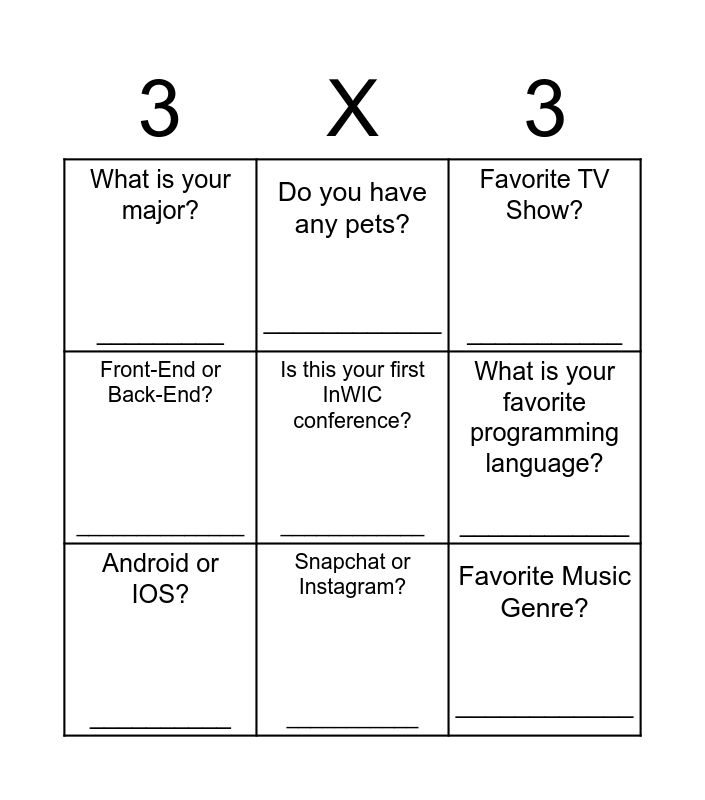 This bingo card has a free space and 8 words: What is your favorite programming language? ____________, Favorite TV Show? ___________, Do you have any pets? ____________, Android or IOS? __________, What is your major? _________, Favorite Music Genre? ____________, Front-End or Back-End? ______________ and Snapchat or Instagram? ___________.