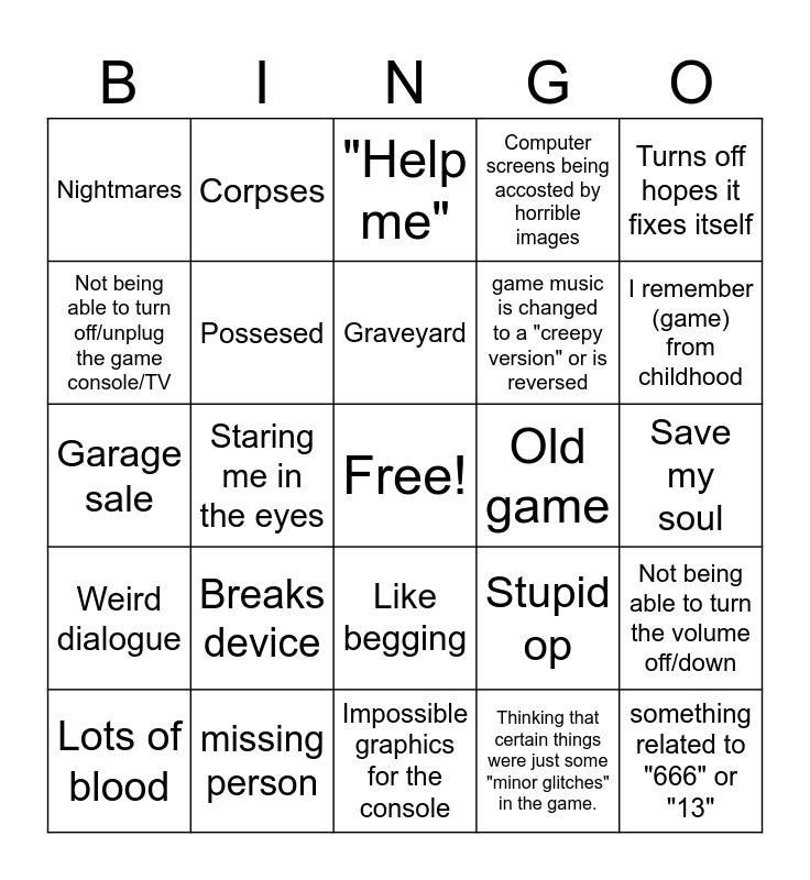 This bingo card has a free space and 33 words: Bad grammer, "Hyper realistic", Staring me in the eyes, The cartridge (disc) is haunted, Weird dialogue, Possesed, Turns off hopes it fixes itself, Lots of blood, Corpses, The game know OP's name, Graveyard, "Help me", Demon, Ghost comes out of game, Old game, I remember (game) from childhood, missing person, Garage sale, Breaks device, Stupid op, Like begging, It happened!?!?!, Nightmares, Save my soul, Impossible graphics for the console, something related to "666" or "13", Computer screens being accosted by horrible images, game music is changed to a "creepy version" or is reversed, Not being able to turn off/unplug the game console/TV, Not being able to turn the volume off/down, "This mod was PMed to me personally/I found it on a skeezy looking site", Thinking that certain things were just some "minor glitches" in the game. and character gets hurt/maimed in the game, the protagonist gets hurt in real life.