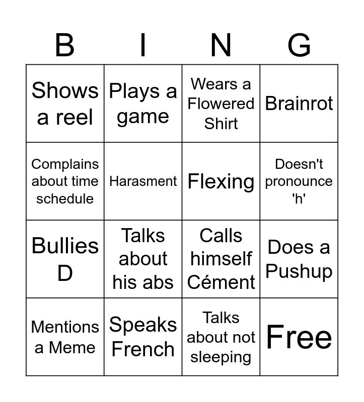 This bingo card has 16 words: Speaks French, Does a Pushup, Wears a Flowered Shirt, Shows a reel, Bullies D, Plays a game, Calls himself Cément, Talks about not sleeping, Complains about time schedule, Harasment, Mentions a Meme, Brainrot, Talks about his abs, Doesn't pronounce 'h', Flexing and Free.