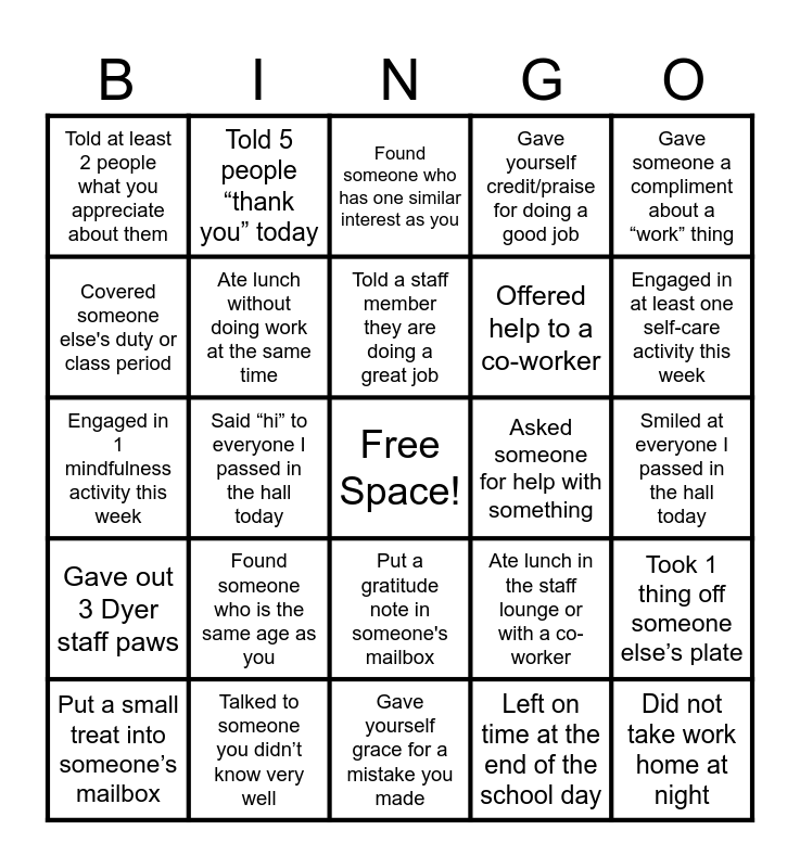 This bingo card has a free space and 24 words: Found someone who is the same age as you, Talked to someone you didn’t know very well, Told a staff member they are doing a great job, Put a small treat into someone’s mailbox, Gave someone a compliment about a “work” thing, Told at least 2 people what you appreciate about them, Covered someone else's duty or class period, Told 5 people “thank you” today, Asked someone for help with something, Put a gratitude note in someone's mailbox, Offered help to a co-worker, Engaged in 1 mindfulness activity this week, Ate lunch in the staff lounge or with a co-worker, Took 1 thing off someone else’s plate, Ate lunch without doing work at the same time, Left on time at the end of the school day, Smiled at everyone I passed in the hall today, Found someone who has one similar interest as you, Engaged in at least one self-care activity this week, Said “hi” to everyone I passed in the hall today, Did not take work home at night, Gave out 3 Dyer staff paws, Gave yourself credit/praise for doing a good job and Gave yourself grace for a mistake you made.