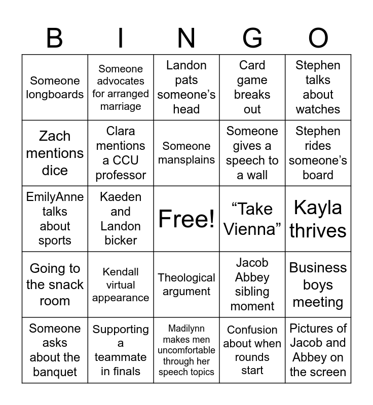 This bingo card has a free space and 24 words: Kendall virtual appearance, Supporting a teammate in finals, Someone mansplains, Someone asks about the banquet, Stephen talks about watches, Someone longboards, Zach mentions dice, Someone advocates for arranged marriage, “Take Vienna”, Theological argument, Someone gives a speech to a wall, EmilyAnne talks about sports, Jacob Abbey sibling moment, Business boys meeting, Clara mentions a CCU professor, Confusion about when rounds start, Kayla thrives, Landon pats someone’s head, Stephen rides someone’s board, Kaeden and Landon bicker, Pictures of Jacob and Abbey on the screen, Going to the snack room, Card game breaks out and Madilynn makes men uncomfortable through her speech topics.