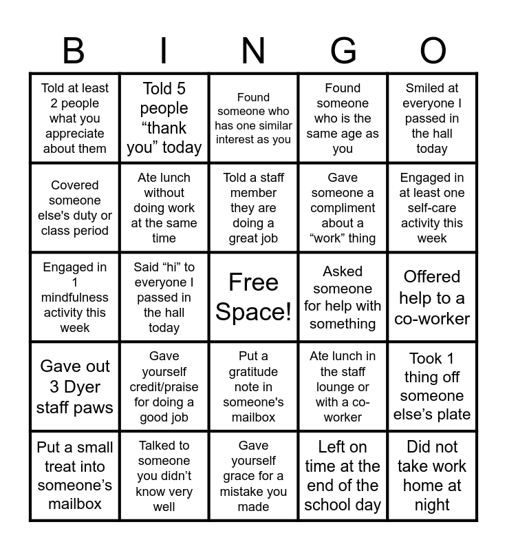 This bingo card has a free space and 24 words: Gave yourself credit/praise for doing a good job, Talked to someone you didn’t know very well, Told a staff member they are doing a great job, Put a small treat into someone’s mailbox, Smiled at everyone I passed in the hall today, Told at least 2 people what you appreciate about them, Covered someone else's duty or class period, Told 5 people “thank you” today, Asked someone for help with something, Put a gratitude note in someone's mailbox, Gave someone a compliment about a “work” thing, Engaged in 1 mindfulness activity this week, Ate lunch in the staff lounge or with a co-worker, Took 1 thing off someone else’s plate, Ate lunch without doing work at the same time, Left on time at the end of the school day, Offered help to a co-worker, Found someone who has one similar interest as you, Engaged in at least one self-care activity this week, Said “hi” to everyone I passed in the hall today, Did not take work home at night, Gave out 3 Dyer staff paws, Found someone who is the same age as you and Gave yourself grace for a mistake you made.