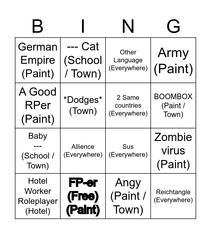 This bingo card has 16 words: FP-er (Free) (Paint), Zombie virus (Paint), Other Language (Everywhere), German Empire (Paint), Baby --- (School / Town), --- Cat (School / Town), Sus (Everywhere), Angy (Paint / Town), A Good RPer (Paint), *Dodges* (Town), Hotel Worker Roleplayer (Hotel), Army (Paint), Allience (Everywhere), BOOMBOX (Paint / Town), 2 Same countries (Everywhere) and Reichtangle (Everywhere).
