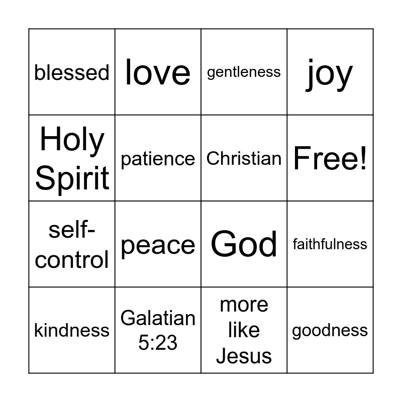 This bingo card has 17 words: more like Jesus, kindness, gentleness, blessed, peace, joy, faithfulness, Christian, Free!, patience, Galatian 5:23, God, Holy Spirit, love, self-control, disciple and goodness.