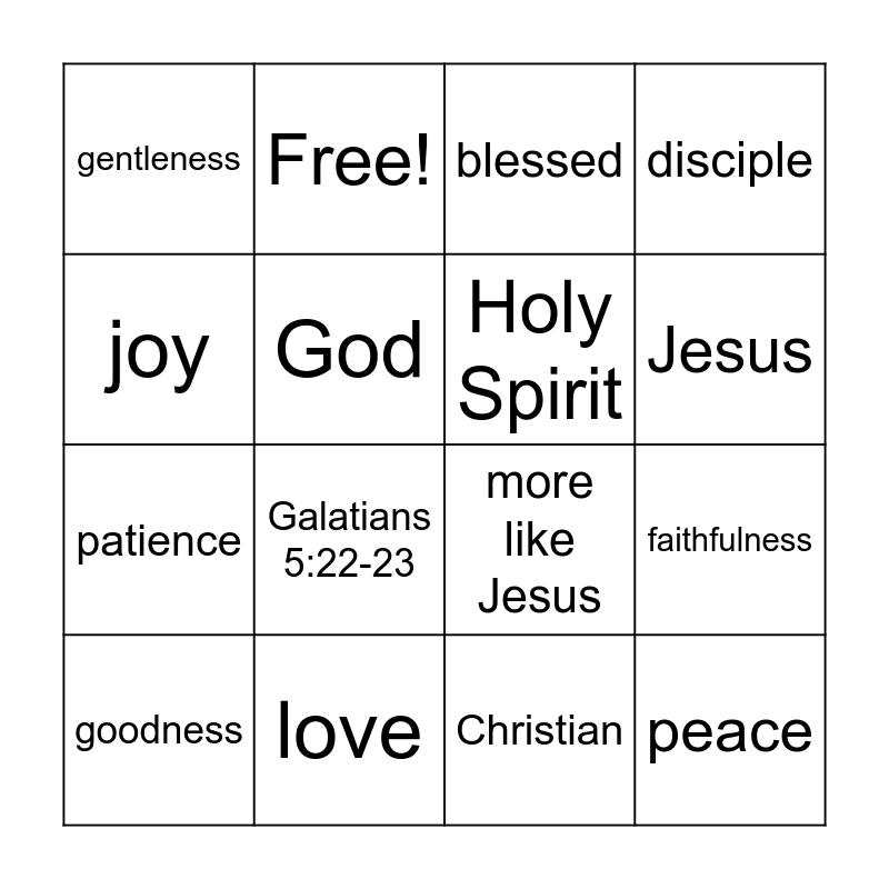 This bingo card has 19 words: more like Jesus, kindness, blessed, peace, faithfulness, joy, Christian, gentleness, Free!, patience, Galatians 5:22-23, God, Holy Spirit, love, goodness, self-control, disciple, Jesus and fruit of the Spirit.