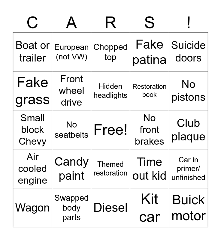 This bingo card has a free space and 24 words: Candy paint, Swapped body parts, Hidden headlights, Wagon, Suicide doors, Boat or trailer, Fake grass, European (not VW), No front brakes, Themed restoration, Restoration book, Small block Chevy, Time out kid, Car in primer/ unfinished, Front wheel drive, Kit car, Club plaque, Chopped top, No pistons, No seatbelts, Buick motor, Air cooled engine, Fake patina and Diesel.
