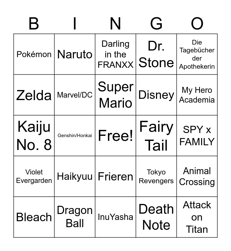 This bingo card has a free space and 44 words: Assassination Classroom, Attack on Titan, Black Clover, Bleach, Chainsaw Man, Death Note, Darling in the FRANXX, Demon Slayer, Die Tagebücher der Apothekerin, Dragon Ball, Dr. Stone, Fairy Tail, Frieren, Haikyuu, HunterxHunter, InuYasha, Jujutsu Kaisen, Kaiju No. 8, Kuroko's Basketball, My Hero Academia, Naruto, One Piece, One Punch Man, Pokémon, Sailor Moon, SPY x FAMILY, Sword Art Online, Tokyo Ghoul, Tokyo Revengers, Violet Evergarden, Wind Breaker, Animal Crossing, Cyberpunk, Final Fantasy, Genshin/Honkai, Infinity Nikki, League of Legends, NieR: Automata Ver1.1a, Super Mario, Zelda, Disney, Ghibli, Marvel/DC and Dino.