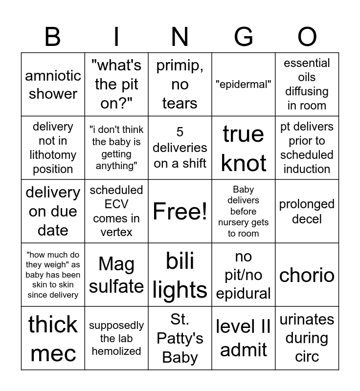 This bingo card has a free space and 24 words: Mag sulfate, supposedly the lab hemolized, 5 deliveries on a shift, thick mec, essential oils diffusing in room, amniotic shower, delivery not in lithotomy position, "what's the pit on?", Baby delivers before nursery gets to room, bili lights, true knot, delivery on due date, no pit/no epidural, chorio, "i don't think the baby is getting anything", level II admit, prolonged decel, primip, no tears, pt delivers prior to scheduled induction, scheduled ECV comes in vertex, urinates during circ, "how much do they weigh" as baby has been skin to skin since delivery, "epidermal" and St. Patty's Baby.
