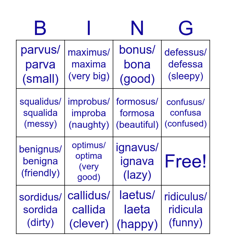 This bingo card has 20 words: Free!, magnus/ magna (big), bonus/ bona (good), minimus/ minima (very small), sordidus/ sordida (dirty), squalidus/ squalida (messy), callidus/ callida (clever), parvus/ parva (small), benignus/ benigna (friendly), maximus/ maxima (very big), optimus/ optima (very good), ignavus/ ignava (lazy), improbus/ improba (naughty), ridiculus/ ridicula (funny), formosus/ formosa (beautiful), strenuus/ strenua (energetic), confusus/ confusa (confused), defessus/ defessa (sleepy), laetus/ laeta (happy) and iratus/ irata (angry).