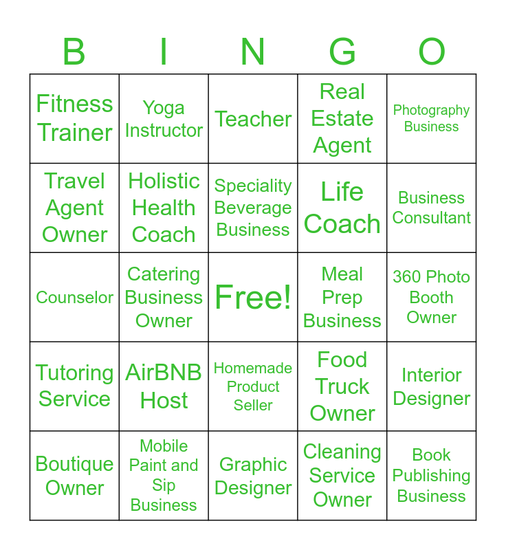 This bingo card has a free space and 46 words: Content Creator, Book Publishing Business, Tax Preparation Service, Graphic Designer, AirBNB Host, Handmade Jewelry Designer, Yoga Instructor, Massage Therapist, Travel Agent Owner, Mental Health Counselor, Holistic Health Coach, Real Estate Agent, Interior Designer, Food Truck Owner, Baker/Pastry Chef, Personal Chef, Speciality Beverage Business, Meal Prep Business, Public Speaking Coach, Photography Business, Catering Business Owner, Cleaning Service Owner, Fitness Trainer, Life Coach, Event Planner, Business Consultant, Boutique Owner, Custom Print Shop Owner, Homemade Product Seller, Tutoring Service, Author, Personal Stylist, Vocalist, Hairdresser, Mobile Notary Service, Mobile Paint and Sip Business, 360 Photo Booth Owner, Home Healthcare, Personal Caretaker, Work From Home, Banker, Teacher, Counselor, Grant Writing Service, Gourmet Candy Business and Insurance Broker.