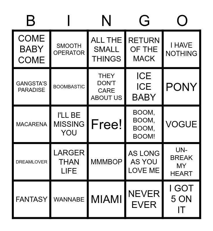 This bingo card has a free space and 82 words: ALL STAR, ALL THAT SHE WANTS, ALL THE SMALL THINGS, ALWAYS BE MY BABY, AROUND THE WORLD, BABY GOT BACK, BABY ONE MORE TIME, BARBIE GIRL, BELIEVE, BE MY LOVER, BLACK OR WHITE, BLUE (DA BA DEE), BOOMBASTIC, BOOM, BOOM, BOOM, BOOM!, BYE BYE BYE, COME BABY COME, FANTASY, GANGSTA'S PARADISE, GENIE IN A BOTTLE, GONNA MAKE YOU SWEAT, HOLD ON, ICE ICE BABY, I GOT 5 ON IT, I HAVE NOTHING, I'LL BE MISSING YOU, I'LL BE THERE FOR YOU, I'M GONNA BE (500 MILES), I WANT IT THAT WAY, JUMPIN, JUMPIN, KISS ME, LARGER THAN LIFE, LIVIN' LA VIDA LOCA, MACARENA, MAMBO NO. 5, MAN! I FEEL LIKE A WOMAN!, MIAMI, NO DIGGITY, NO SCRUBS, PONY, QUIT PLAYING GAMES, REMEMBER THE TIME, RETURN OF THE MACK, SAY MY NAME, SCATMAN, THE SIGN, SMOOTH OPERATOR, STAYIN' ALIVE, THEY DON'T CARE ABOUT US, THIS IS HOW WE DO IT, TWO PRINCES, U CAN'T TOUCH THIS, VOGUE, WANNABE, WATERFALLS, WHAT A GIRL WANTS, WHAT IS LOVE, YOU'LL BE IN MY HEART, 2 BECOME 1, ALL MY LIFE, AS LONG AS YOU LOVE ME, BAILAMOS, CRUSH, DREAMLOVER, EVERY MORNING, FLY, GIVE IT TO YOU, HERE COMES THE HOTSTEPPER, HOW DO I LIVE, I DO (CHERISH YOU), I KNEW I LOVED YOU, IF YOU HAD MY LOVE, LOVEFOOL, MMMBOP, NEVER EVER, SHOW ME LOVE, SOMETIMES, TEARIN’ UP MY HEART, THE POWER, TOGETHER AGAIN, TUBTHUMPING, UN-BREAK MY HEART and WAITING FOR TONIGHT.