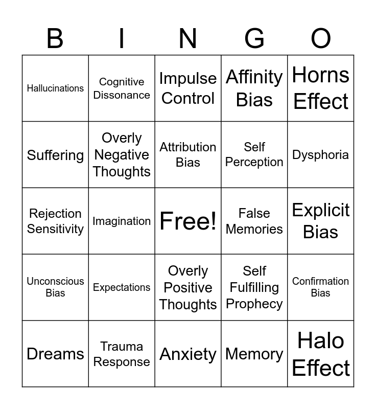 This bingo card has a free space and 24 words: Expectations, Trauma Response, Attribution Bias, Dreams, Horns Effect, Hallucinations, Suffering, Cognitive Dissonance, False Memories, Overly Positive Thoughts, Self Perception, Rejection Sensitivity, Self Fulfilling Prophecy, Confirmation Bias, Overly Negative Thoughts, Memory, Explicit Bias, Impulse Control, Dysphoria, Imagination, Halo Effect, Unconscious Bias, Affinity Bias and Anxiety.