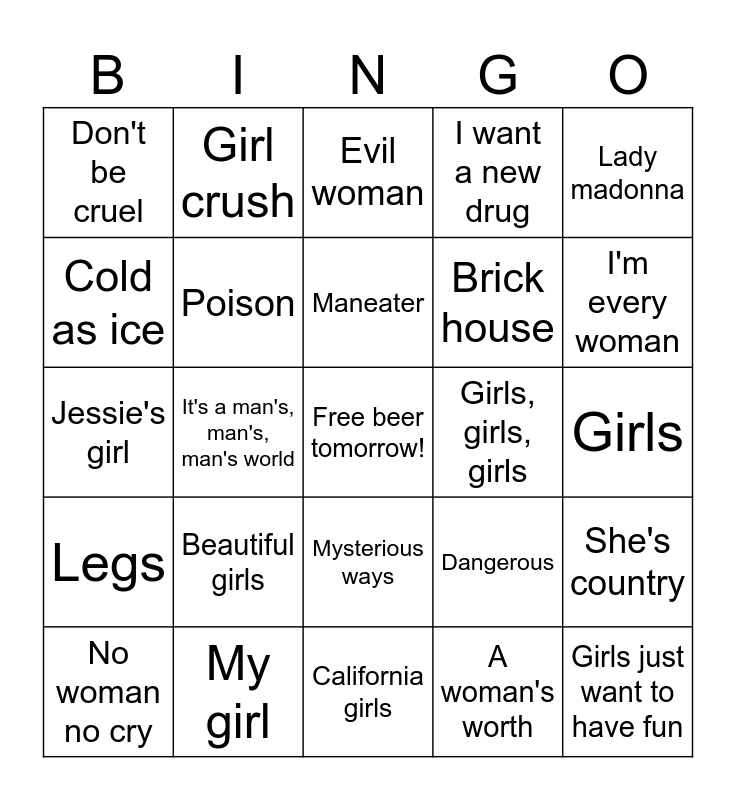 This bingo card has a free space and 39 words: Your body is a wonderland, You give love a bad name, Witchy woman, Poison, No woman no cry, Mysterious ways, Maneater, Little miss can't be wrong, Lady madonna, Legs, It's a man's, man's, man's world, I want a new drug, Girls just want to have fun, Girls, Girls, girls, girls, Beautiful girls, Fat bottomed girls, Don't be cruel, Dirty dianna, Dangerous, Cold as ice, California girls, Brick house, I'm every woman, All-american girl, Somebody like you, Independent women, I got a woman, Man! I feel like a woman!, Girl crush, Milkshake, Run the world (girls), Evil woman, My girl, A woman's worth, Roxanne, She's country, Jessie's girl and California gurls.