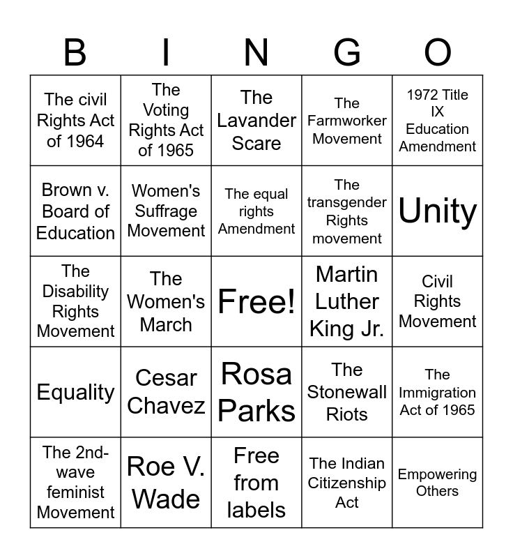 This bingo card has a free space and 24 words: Cesar Chavez, Roe V. Wade, The equal rights Amendment, The 2nd-wave feminist Movement, 1972 Title IX Education Amendment, The civil Rights Act of 1964, Brown v. Board of Education, The Voting Rights Act of 1965, Martin Luther King Jr., Rosa Parks, The transgender Rights movement, The Disability Rights Movement, The Stonewall Riots, The Immigration Act of 1965, Women's Suffrage Movement, The Indian Citizenship Act, Civil Rights Movement, The Lavander Scare, Unity, The Women's March, Empowering Others, Equality, The Farmworker Movement and Free from labels.