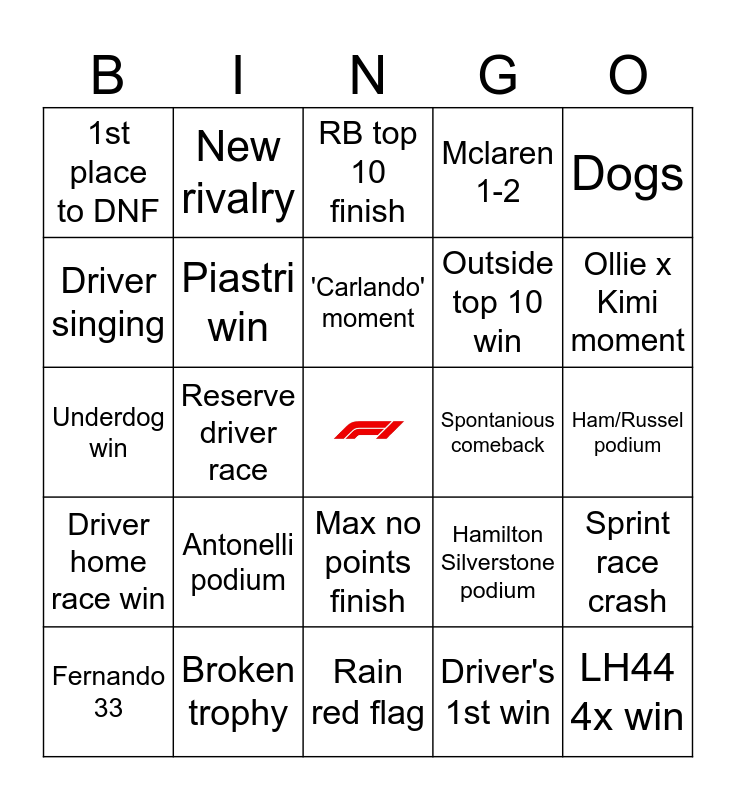 This bingo card has a free space and 24 words: Antonelli podium, Broken trophy, 'Carlando' moment, Fernando 33, Dogs, 1st place to DNF, Driver singing, New rivalry, Spontanious comeback, Max no points finish, Outside top 10 win, Underdog win, Hamilton Silverstone podium, Sprint race crash, Piastri win, Driver's 1st win, Ham/Russel podium, RB top 10 finish, Ollie x Kimi moment, Reserve driver race, LH44 4x win, Driver home race win, Mclaren 1-2 and Rain red flag.