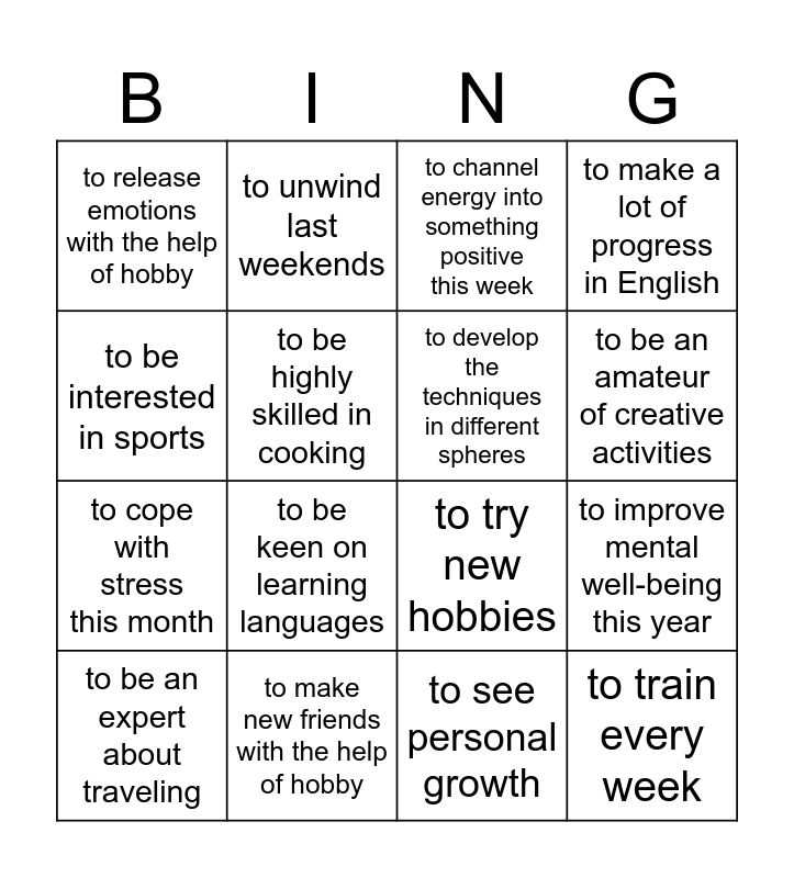 This bingo card has 16 words: to make new friends with the help of hobby, to improve mental well-being this year, to channel energy into something positive this week, to release emotions with the help of hobby, to cope with stress this month, to unwind last weekends, to try new hobbies, to see personal growth, to be interested in sports, to be highly skilled in cooking, to be an expert about traveling, to make a lot of progress in English, to be keen on learning languages, to be an amateur of creative activities, to develop the techniques in different spheres and to train every week.