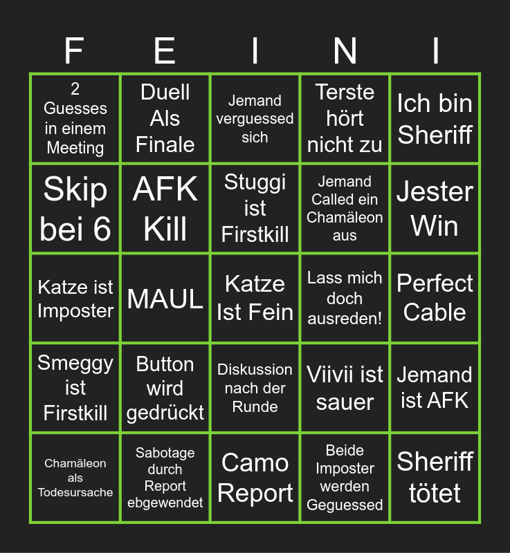 This bingo card has a free space and 24 words: Button wird gedrückt, Sabotage durch Report ebgewendet, Stuggi ist Firstkill, Chamäleon als Todesursache, Ich bin Sheriff, 2 Guesses in einem Meeting, Skip bei 6, Duell Als Finale, Lass mich doch ausreden!, Diskussion nach der Runde, Jemand Called ein Chamäleon aus, Katze ist Imposter, Viivii ist sauer, Jemand ist AFK, AFK Kill, Beide Imposter werden Geguessed, Perfect Cable, Jemand verguessed sich, Jester Win, MAUL, Sheriff tötet, Smeggy ist Firstkill, Terste hört nicht zu and Camo Report.