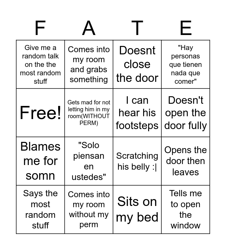 This bingo card has 16 words: Comes into my room without my perm, Opens the door then leaves, Doesnt close the door, Give me a random talk on the the most random stuff, Blames me for somn, Comes into my room and grabs something, Scratching his belly :|, Sits on my bed, Free!, Gets mad for not letting him in my room(WITHOUT PERM), Says the most random stuff, "Hay personas que tienen nada que comer", "Solo piensan en ustedes", Doesn't open the door fully, I can hear his footsteps and Tells me to open the window.
