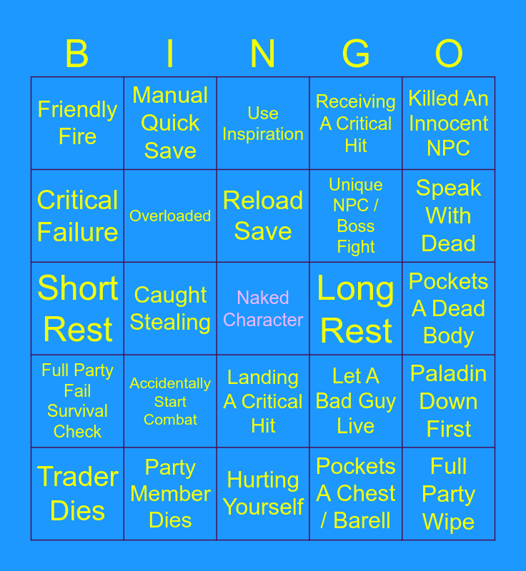 This bingo card has a free space and 24 words: Accidentally Start Combat, Party Member Dies, Reload Save, Trader Dies, Killed An Innocent NPC, Friendly Fire, Critical Failure, Manual Quick Save, Long Rest, Landing A Critical Hit, Unique NPC / Boss Fight, Short Rest, Let A Bad Guy Live, Paladin Down First, Overloaded, Pockets A Chest / Barell, Pockets A Dead Body, Use Inspiration, Speak With Dead, Caught Stealing, Full Party Wipe, Full Party Fail Survival Check, Receiving A Critical Hit and Hurting Yourself.