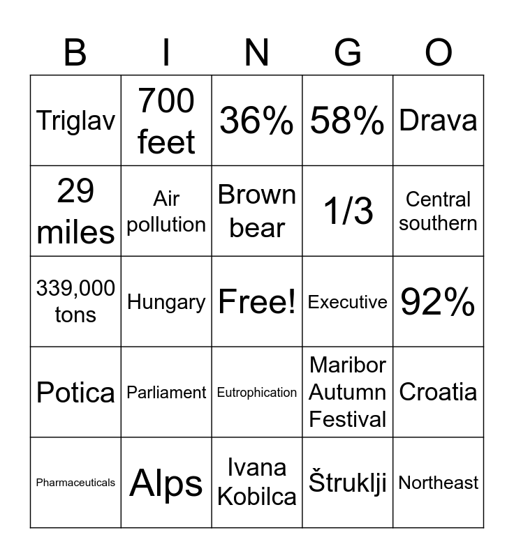 This bingo card has a free space and 29 words: 45N and 13E, Alps, 36%, 2.12 million, Drava, Triglav, Air pollution, Brown bear, Executive, Croatia, Pharmaceuticals, Hungary, Štruklji, Northeast, 339,000 tons, Balkan, Ivana Kobilca, Maribor Autumn Festival, Central southern, Potica, Parliament, Omar Nader, 1/3, 92%, 29 miles, 700 feet, Eutrophication, 58% and Hiking.