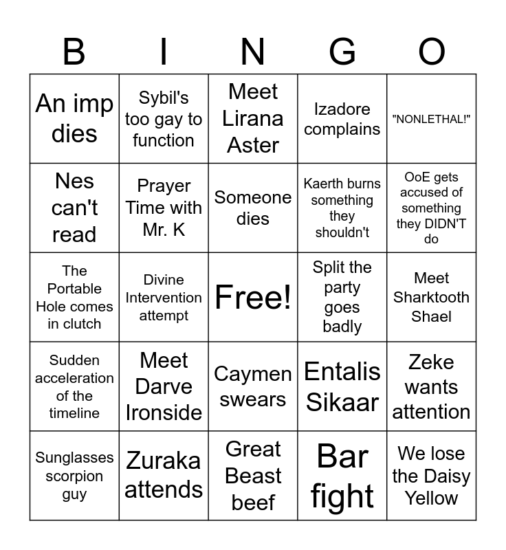 This bingo card has a free space and 24 words: Meet Darve Ironside, Zuraka attends, Someone dies, Sunglasses scorpion guy, "NONLETHAL!", An imp dies, Nes can't read, Sybil's too gay to function, Split the party goes badly, Caymen swears, Kaerth burns something they shouldn't, The Portable Hole comes in clutch, Entalis Sikaar, Zeke wants attention, Prayer Time with Mr. K, Bar fight, Meet Sharktooth Shael, Meet Lirana Aster, OoE gets accused of something they DIDN'T do, Divine Intervention attempt, We lose the Daisy Yellow, Sudden acceleration of the timeline, Izadore complains and Great Beast beef.