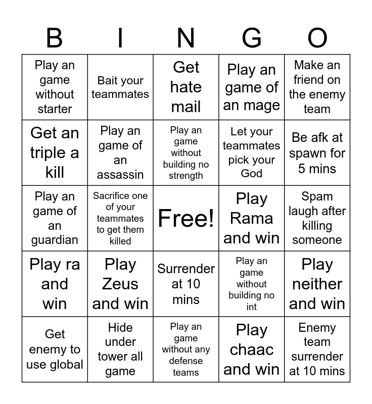 This bingo card has a free space and 24 words: Play Zeus and win, Hide under tower all game, Play an game without building no strength, Get enemy to use global, Make an friend on the enemy team, Play an game without starter, Get an triple a kill, Bait your teammates, Play Rama and win, Surrender at 10 mins, Let your teammates pick your God, Play an game of an guardian, Play an game without building no int, Play neither and win, Play an game of an assassin, Play chaac and win, Spam laugh after killing someone, Get hate mail, Be afk at spawn for 5 mins, Sacrifice one of your teammates to get them killed, Enemy team surrender at 10 mins, Play ra and win, Play an game of an mage and Play an game without any defense teams.