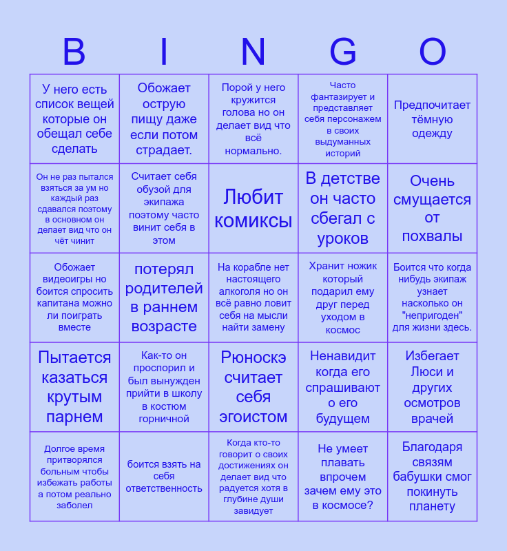 This bingo card has a free space and 24 words: Долгое время притворялся больным чтобы избежать работы а потом реально заболел, Как-то он проспорил и был вынужден прийти в школу в костюм горничной, Любит комиксы, Не умеет плавать впрочем зачем ему это в космосе?, Предпочитает тёмную одежду, У него есть список вещей которые он обещал себе сделать, Обожает острую пищу даже если потом страдает., Порой у него кружится голова но он делает вид что всё нормально., Хранит ножик который подарил ему друг перед уходом в космос, Боится что когда нибудь экипаж узнает насколько он "непригоден" для жизни здесь., Обожает видеоигры но боится спросить капитана можно ли поиграть вместе, Считает себя обузой для экипажа поэтому часто винит себя в этом, Ненавидит когда его спрашивают о его будущем, Избегает Люси и других осмотров врачей, Он не раз пытался взяться за ум но каждый раз сдавался поэтому в основном он делает вид что он чёт чинит, боится взять на себя ответственность, Когда кто-то говорит о своих достижениях он делает вид что радуется хотя в глубине души завидует, Часто фантазирует и представляет себя персонажем в своих выдуманных историй, Очень смущается от похвалы, Пытается казаться крутым парнем, потерял родителей в раннем возрасте, Рюноскэ считает себя эгоистом, В детстве он часто сбегал с уроков and Благодаря связям бабушки смог покинуть планету.