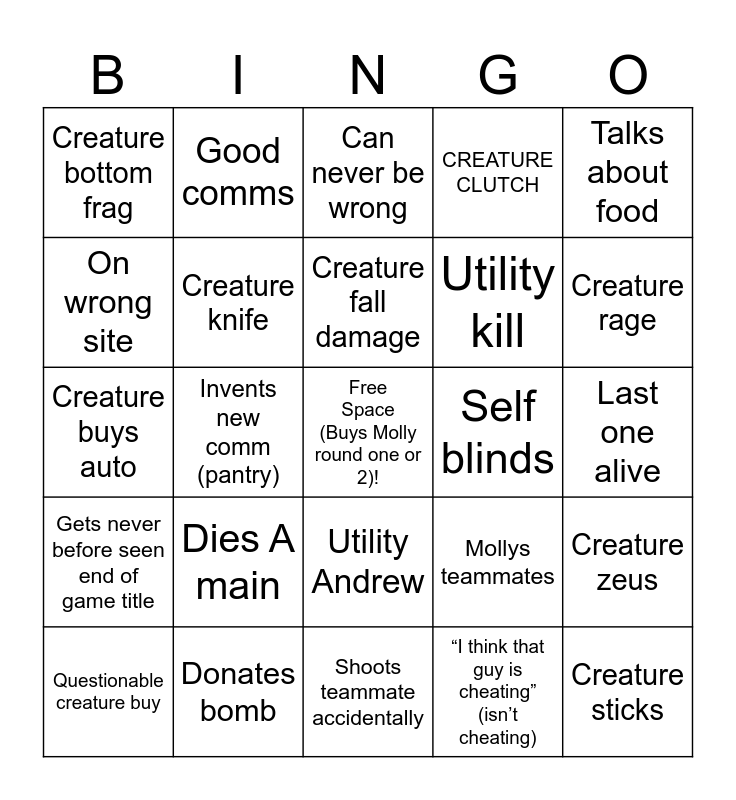 This bingo card has a free space and 25 words: Dies A main, Shoots teammate accidentally, Creature fall damage, Questionable creature buy, Talks about food, Creature bottom frag, On wrong site, Good comms, Self blinds, Utility Andrew, Utility kill, Creature buys auto, Mollys teammates, Creature zeus, Creature knife, “THE CREETCHERRRRRRR”, Last one alive, Can never be wrong, Creature rage, Invents new comm (pantry), Creature sticks, Donates bomb, Gets never before seen end of game title, CREATURE CLUTCH and “I think that guy is cheating” (isn’t cheating).