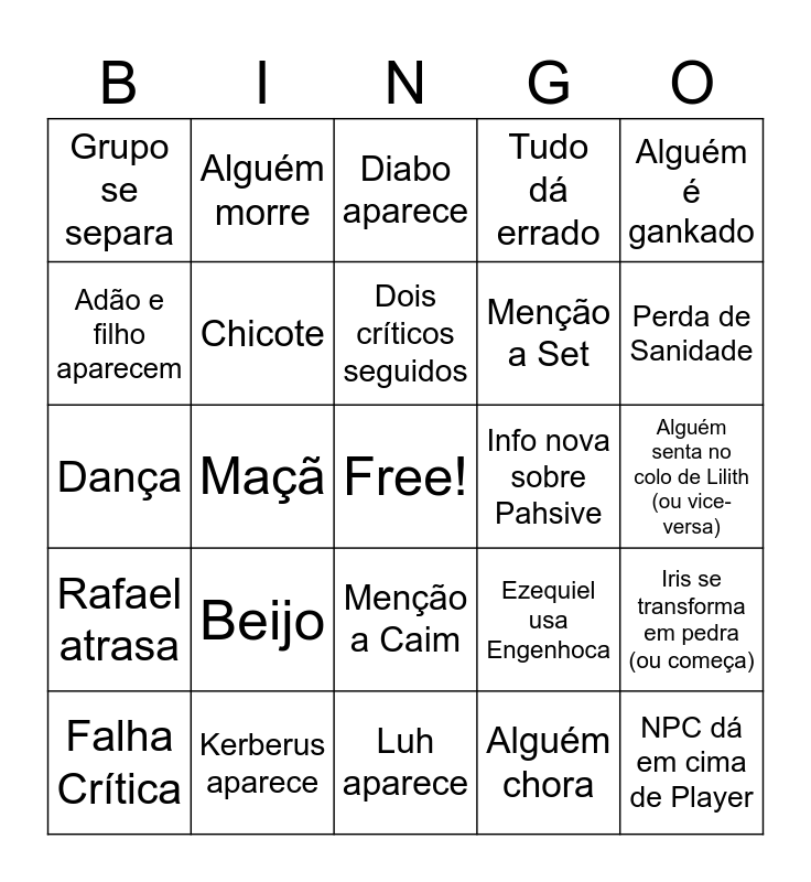 This bingo card has a free space and 24 words: Beijo, Kerberus aparece, Dois críticos seguidos, Falha Crítica, Alguém é gankado, Grupo se separa, Adão e filho aparecem, Alguém morre, Info nova sobre Pahsive, Menção a Caim, Menção a Set, Dança, Ezequiel usa Engenhoca, Iris se transforma em pedra (ou começa), Chicote, Alguém chora, Alguém senta no colo de Lilith (ou vice-versa), Diabo aparece, Perda de Sanidade, Maçã, NPC dá em cima de Player, Rafael atrasa, Tudo dá errado and Luh aparece.