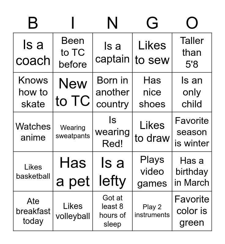 This bingo card has a free space and 24 words: Has a pet, Likes volleyball, Born in another country, Ate breakfast today, Taller than 5'8, Is a coach, Knows how to skate, Been to TC before, Likes to draw, Is a lefty, Has nice shoes, Watches anime, Plays video games, Has a birthday in March, New to TC, Play 2 instruments, Favorite season is winter, Is a captain, Is an only child, Wearing sweatpants, Favorite color is green, Likes basketball, Likes to sew and Got at least 8 hours of sleep.
