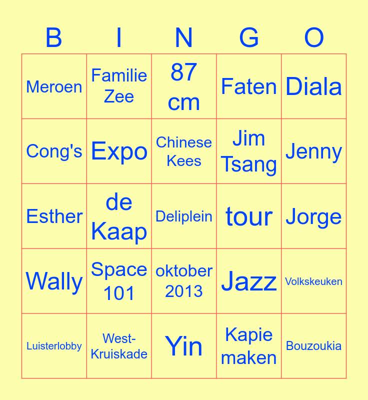 This bingo card has 75 words: 1894, 1960, 87 cm, Abeer, Adison, Anahid, Anamarie, Anja, Atjehstraat, B'emnet, Bouzoukia, Chinatown, Chinese Kees, Cong's, David, de Kaap, de Kade, Deliplein, Depot, Diala, Dolf, Esther, Expo, Familie Zee, Faten, Fenix, Gastenverblijf, gids, Hevien, Holland Amerika Lijn, hummus, Ishmail, Janus van Dijk, Jazz, Jenny, Jim Tsang, Joop, Joran, Jorge, Kapie maken, Kenia, Kid Dynamite, Kookstudio, Koor, Linda, Linzensoep, Luisterlobby, Meroen, Myriam, Nachtclub, Nevill, oktober 2013, Paola, Portugal, Rewaq, Rijnhavenbrug, Rince, ROS, Rotterdam, Rotterdam Ontrafelt…, Space 101, Spanje, Sportdorp, Teddy Cotton, Tooschie Mok, tour, Turkije, Verhalenkeet, verteller, Volkskeuken, Wally, West-Kruiskade, worsteltent, Yin and Zainab.