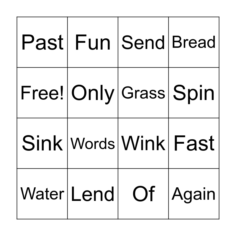 This bingo card has 16 words: Lend, Fast, Send, Past, Sink, Fun, Wink, Of, Free!, Only, Water, Bread, Words, Spin, Grass and Again.