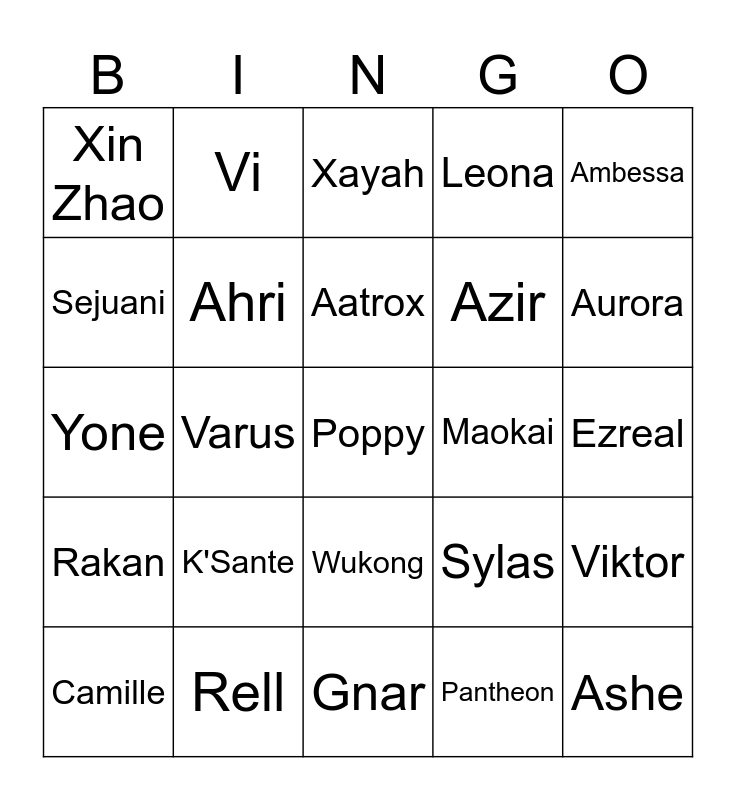 This bingo card has 25 words: K'Sante, Gnar, Aatrox, Camille, Ambessa, Xin Zhao, Sejuani, Vi, Maokai, Wukong, Azir, Yone, Sylas, Viktor, Ahri, Ashe, Ezreal, Xayah, Aurora, Varus, Poppy, Rell, Rakan, Leona and Pantheon.