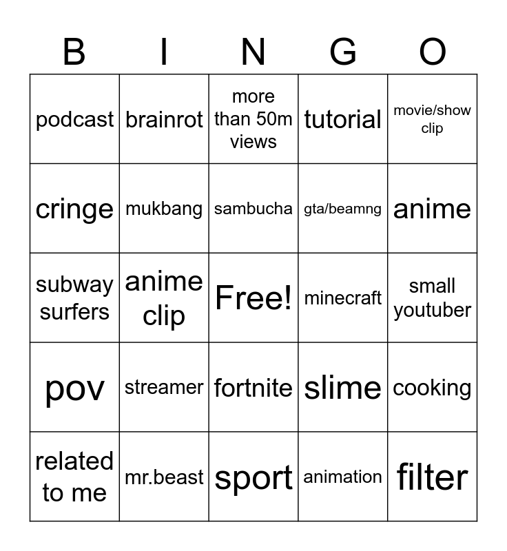 This bingo card has a free space and 24 words: streamer, mr.beast, sambucha, related to me, movie/show clip, podcast, cringe, brainrot, minecraft, fortnite, gta/beamng, subway surfers, slime, cooking, mukbang, animation, small youtuber, more than 50m views, anime, anime clip, filter, pov, tutorial and sport.