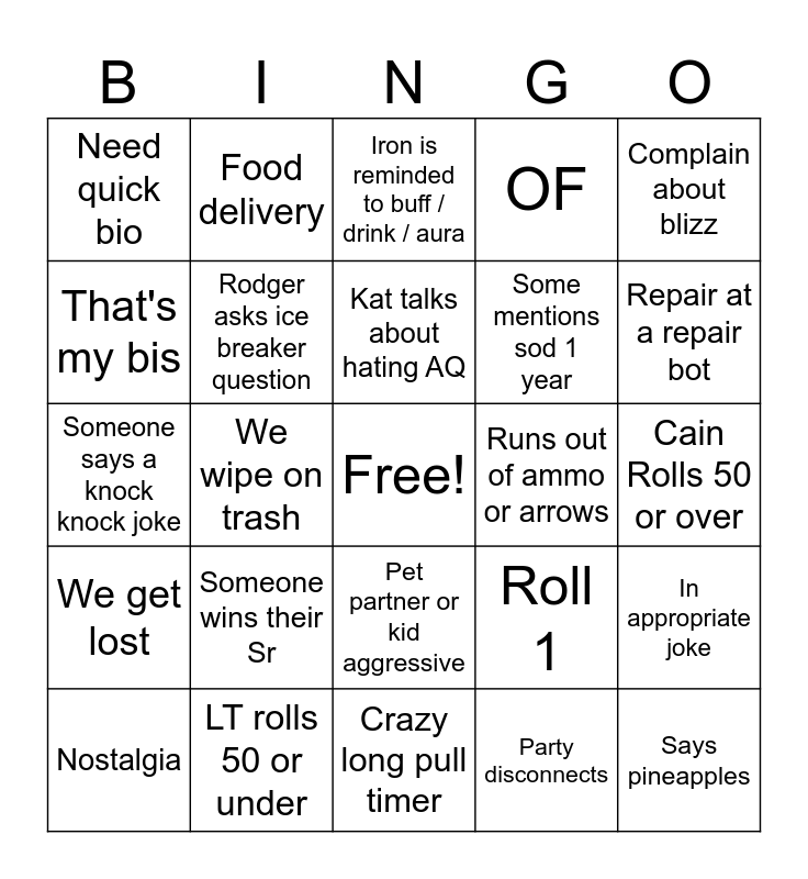 This bingo card has a free space and 32 words: Party disconnects, RF isn't on, We wipe on trash, Wipe on a boss, We get lost, Rodger asks ice breaker question, Complain about blizz, In appropriate joke, Food delivery, Runs to wrong entrance, Kat talks about hating AQ, Iron is reminded to buff / drink / aura, Someone tries to give away loot they won, Buffs on pets, Runs out of ammo or arrows, Run out of pop a NR pot, Nostalgia, Someone says a knock knock joke, Pet partner or kid aggressive, Someone wins their Sr, Roll 1, Roll 99, Cain Rolls 50 or over, LT rolls 50 or under, Says pineapples, OF, Some mentions sod 1 year, That's my bis, Need quick bio, Crazy long pull timer, Enuendo and Repair at a repair bot.