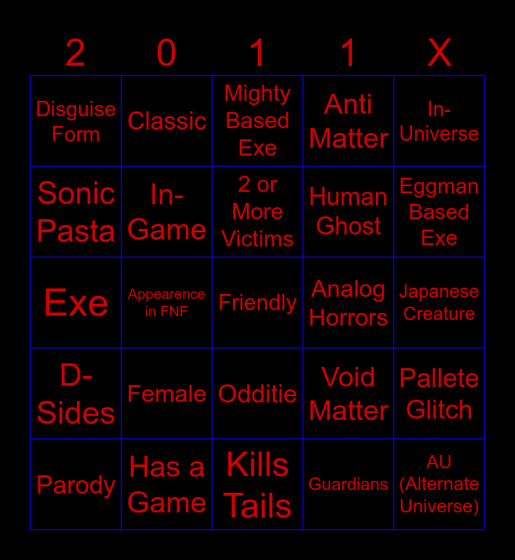 This bingo card has 35 words: Sonic Based Exe, Virus, Tails Based Exe, In-Game, Odditie, Anti Matter, Sonic Pasta, Retake Version of X, 2 or More Victims, Biological Thing, Exe, In-Universe, AI, Sonic Shuffle/Sonic Mix, Disguise Form, Analog Horrors, Guardians, Appearence in FNF, D-Sides, Friendly, Void Matter, Parody, Pallete Glitch, Has a Game, Mighty Based Exe, Eggman Based Exe, AU (Alternate Universe), Demon, Human Ghost, Japanese Creature, Uses Fire, Kills Tails, Female, Classic and FREE!.