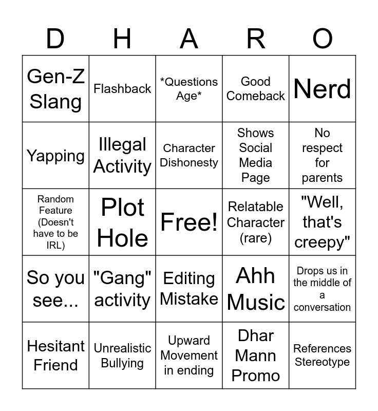 This bingo card has a free space and 30 words: Unrealistic Bullying, Familiar Bully, Plot Hole, Random Pop Culture Reference Quentin Understands, Gen-Z Slang, *Questions Age*, Illegal Activity, Editing Mistake, Relatable Character (rare), Upward Movement in ending, "Well, that's creepy", References Stereotype, Dhar Mann Promo, Repeated Quote, No respect for parents, Quentin Tweaks Out, Ahh Music, So you see..., "Gang" activity, Nerd, Random Feature (Doesn't have to be IRL), Victim-Blaming, Flashback, Shows Social Media Page, Yapping, Good Comeback, Drops us in the middle of a conversation, Hesitant Friend, Character Dishonesty and No common sense.