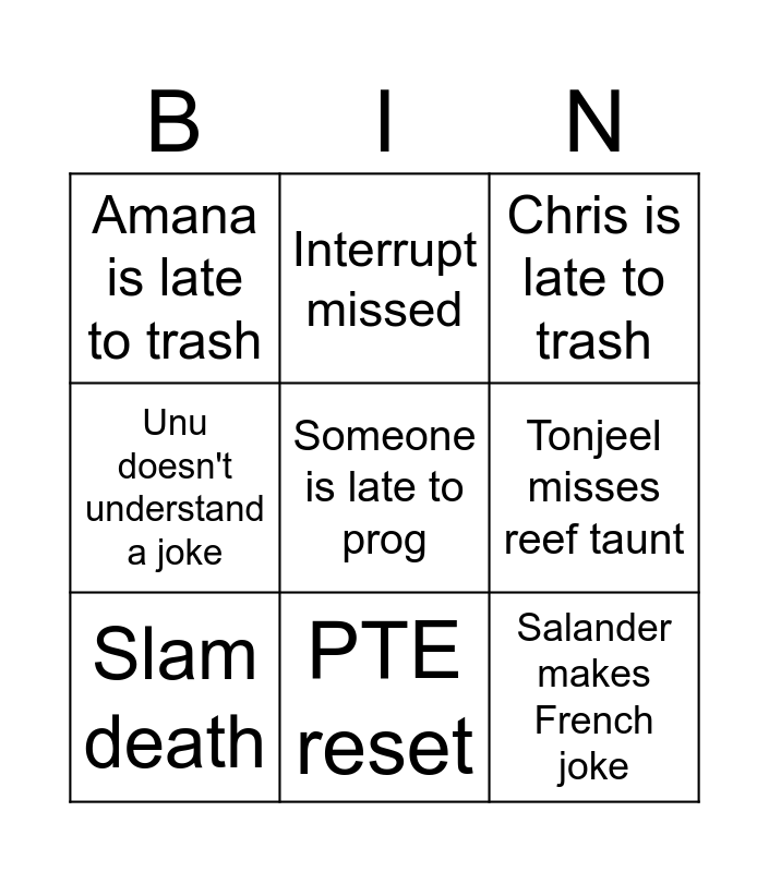 This bingo card has 22 words: El Tundra mentioned, 0 Vitality, Interrupt missed, Wave death, Tonjeel misses reef taunt, Slam death, Amana is late to trash, Chris is late to trash, Tundra stares, Jala says "OMG", Salander makes French joke, Unu doesn't understand a joke, Full vit to Taleria, Disco cone, Fire spread, Siren death, Bridge wipe, Fail Deluge, Reef fail, Someone is late to prog, PTE reset and Someone falls to death.