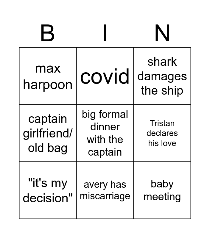 This bingo card has 9 words: "it's my decision", shark damages the ship, covid, captain girlfriend/ old bag, max harpoon, Tristan declares his love, big formal dinner with the captain, baby meeting and avery has miscarriage.