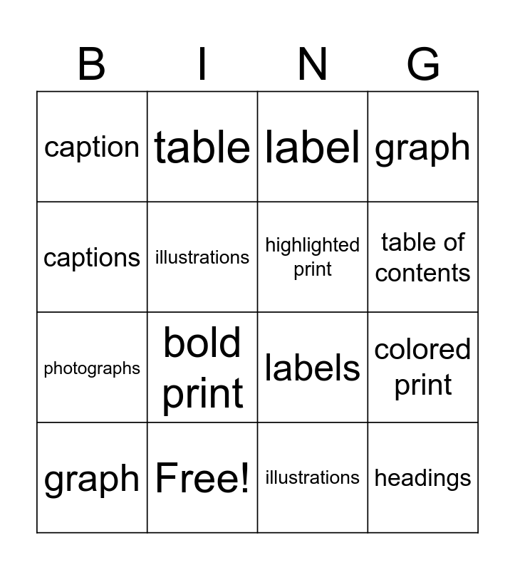 This bingo card has 29 words: bold print, italicized print, colored print, heading, caption, label, highlighted print, map, Free!, photograph, illustrations, graph, table, diagrams, bold print, italicized print, colored print, headings, captions, labels, highlighted print, maps, photographs, illustrations, graph, table, diagram, table of contents and title.