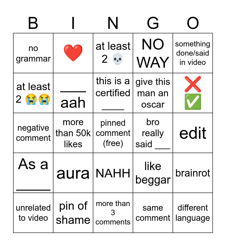 This bingo card has a free space and 24 words: aura, pin of shame, this is a certified ____, unrelated to video, something done/said in video, no grammar, at least 2 😭😭, ❤️, bro really said ___, NAHH, give this man an oscar, negative comment, like beggar, brainrot, ___ aah, same comment, edit, at least 2 💀, ❌ ✅, more than 50k likes, different language, As a ____, NO WAY and more than 3 comments.