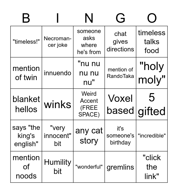 This bingo card has a free space and 24 words: "very innocent" bit, Humility bit, "nu nu nu nu nu", mention of noods, timeless talks food, "timeless!", mention of twin, Necroman-cer joke, Voxel based, any cat story, mention of RandoTaka, blanket hellos, it's someone's birthday, "incredible", innuendo, gremlins, 5 gifted, someone asks where he's from, "holy moly", winks, "click the link", says "the king's english", chat gives directions and "wonderful".