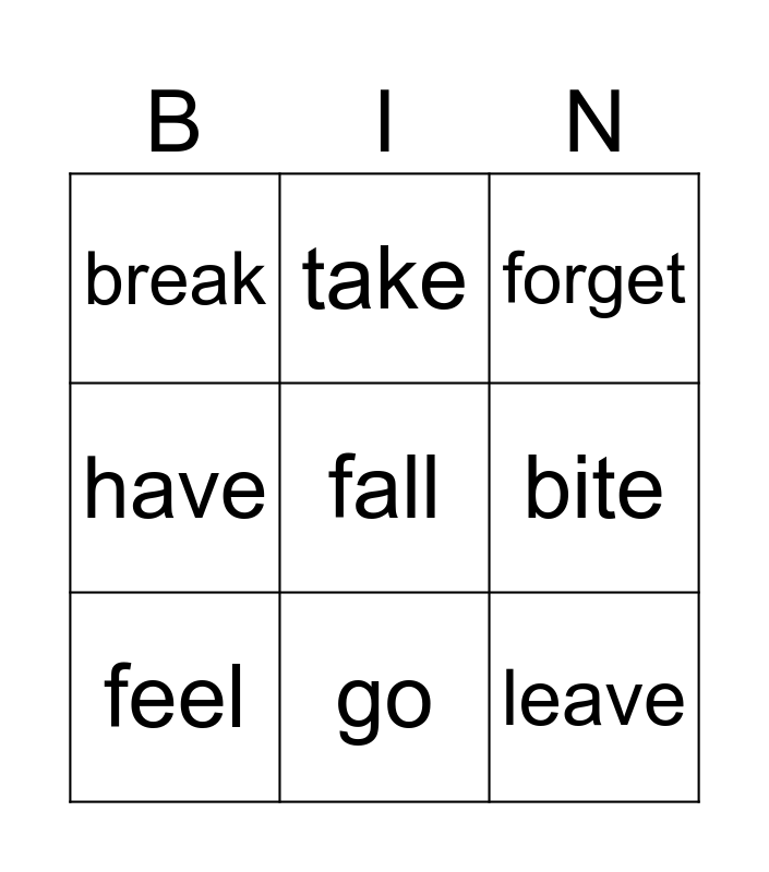 This bingo card has a free space and 8 words: bite, forget, take, feel, break, leave, have and go.