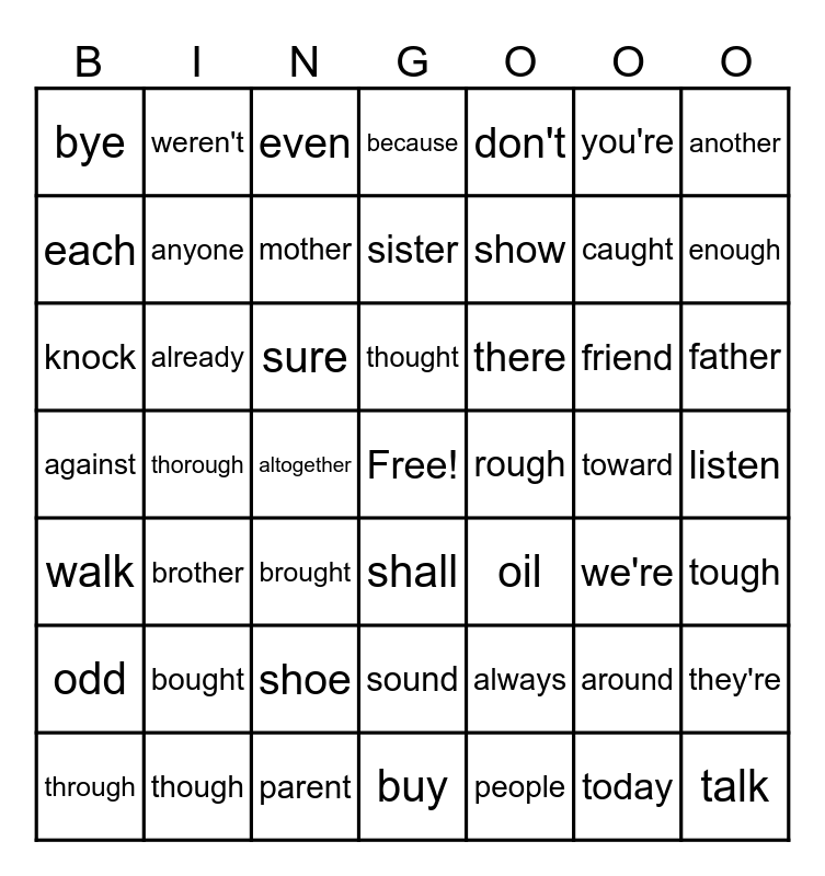 This bingo card has a free space and 58 words: above, against, almost, already, altogether, always, another, answer, anyone, around, because, bought, brought, brother, buy, bye, caught, don't, door, each, enough, even, father, friend, ghost, knock, listen, love, mother, oil, page, odd, parent, people, rough, shall, shoe, show, sister, sound, sure, talk, there, these, they're, through, though, thought, thorough, today, tough, toward, walk, we're, weren't, whom, you're and world.