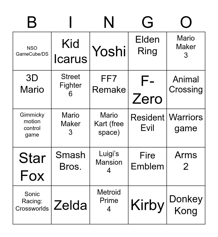 This bingo card has a free space and 24 words: Smash Bros., Zelda, FF7 Remake, Sonic Racing: Crossworlds, Mario Maker 3, NSO GameCube/DS, 3D Mario, Kid Icarus, Resident Evil, Luigi’s Mansion 4, F-Zero, Gimmicky motion control game, Fire Emblem, Arms 2, Street Fighter 6, Kirby, Warriors game, Yoshi, Animal Crossing, Mario Maker 3, Donkey Kong, Star Fox, Elden Ring and Metroid Prime 4.