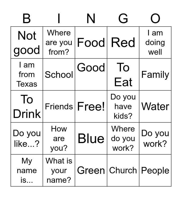 This bingo card has a free space and 24 words: How are you?, What is your name?, Good, My name is..., I am doing well, Not good, I am from Texas, Where are you from?, Do you have kids?, Blue, To Eat, To Drink, Where do you work?, Do you work?, School, Church, Water, Food, Family, Friends, People, Do you like...?, Red and Green.